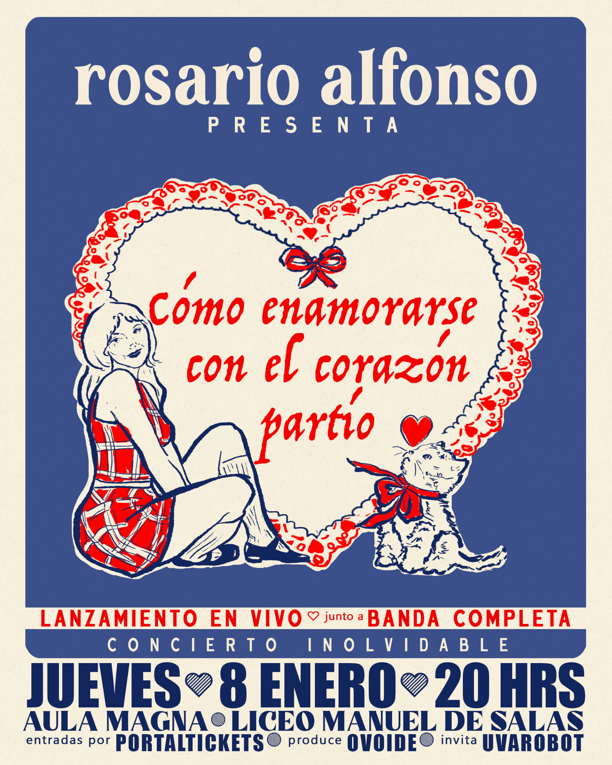 El próximo jueves 8 de enero de 2026, Rosario Alfonso estrenará oficialmente su esperado tercer disco “Cómo enamorarse con el corazón partío” con un concierto imperdible en el Aula Magna del Liceo Manuel de Salas (Ñuñoa). Acompañada de su banda completa y de invitados especiales, la cantautora chilena ofrecerá un recorrido por las canciones, poemas y pasajes que componen este álbum, un trabajo que se instala como una especie de manual emocional sobre el amor en todas sus formas. Además, el show incluirá una selección de temas de sus discos anteriores, “Lo Primero” (2018) y “De canciones tristes y otras sutilezas” (2022), permitiendo al público reencontrarse con distintas etapas de su trayectoria y con la sensibilidad que ha marcado su propuesta desde los inicios.