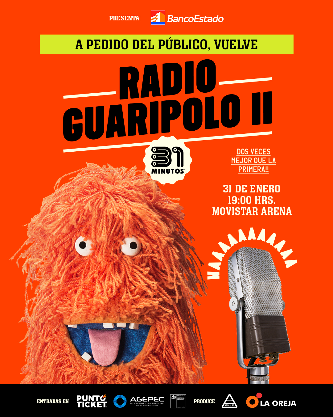 El querido elenco de 31 Minutos regresa con una nueva edición de su espectáculo en vivo, esta vez acompañado por BancoEstado, para ofrecer una experiencia única llena de música, humor y nostalgia en el Movistar Arena.