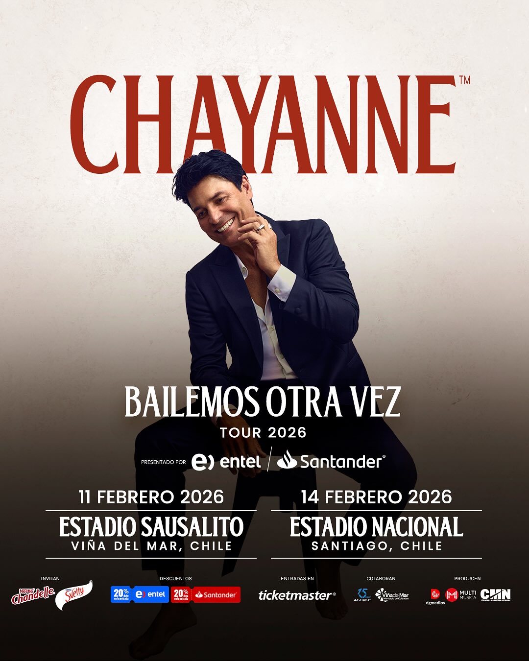 Luego de un exitoso paso por Chile, con 8 fechas agotadas y reuniendo a más de 100.000 personas en su Bailemos Otra Vez Tour, Chayanne confirma que se presentará el próximo 11 de febrero en el Estadio Sausalito de Viña del Mar y el 14 de febrero en el Estadio Nacional de Santiago.